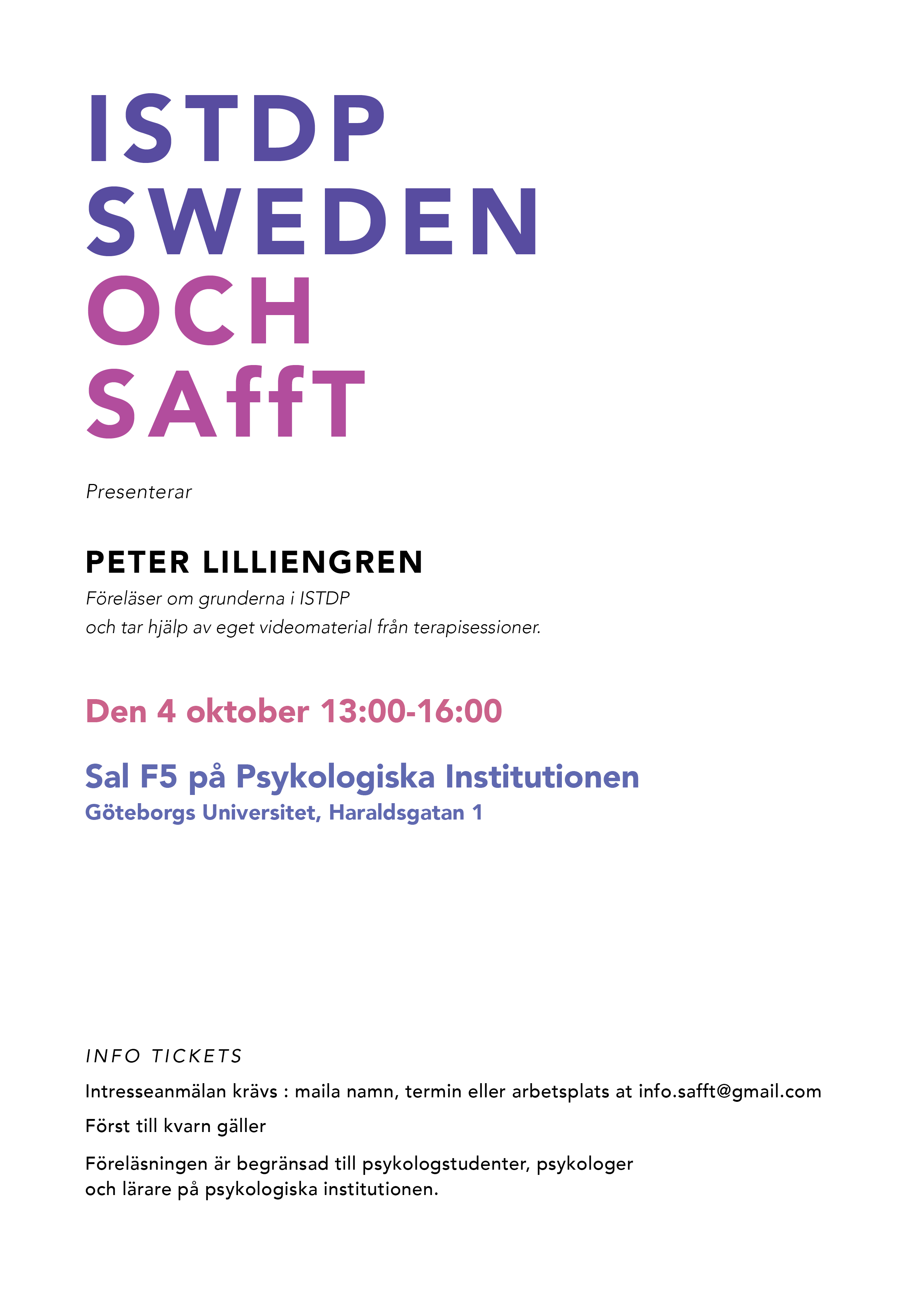 Studentnätverket för affektfokuserade terapiformer (SAffT) och Svenska föreningen för ISTDP bjuder in till gratis föreläsning på Göteborgs Universitet. Varmt välkomna!