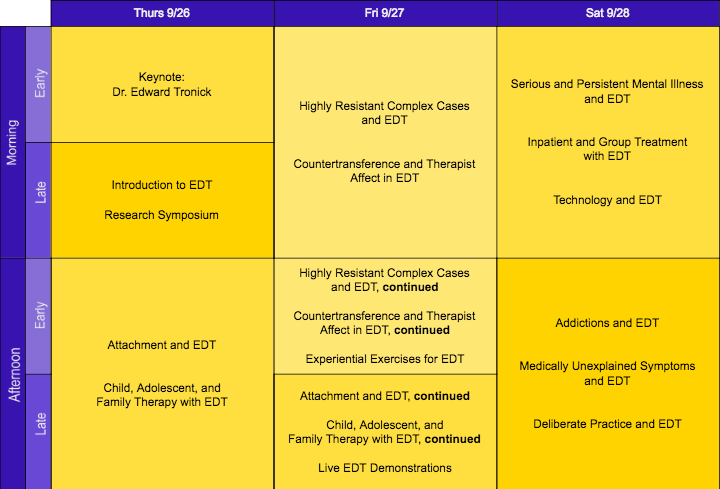 Tonvikten under konferensen ligger på kliniska presentationer, och i år kommer panelerna att avhandla diverse ämnen såsom beroendeproblematik, ISTDP i slutenvårdsformat, deliberate practice, medicinskt oförklarade symptom och behandling av barn och unga. Flera av de största namnen inom upplevelsebaserad psykodynamisk terapi kommer att föreläsa: Patricia Coughlin, Tony Rousmaniere, Kristin Osborn, Allan Abbass, Jon Frederickson med flera.